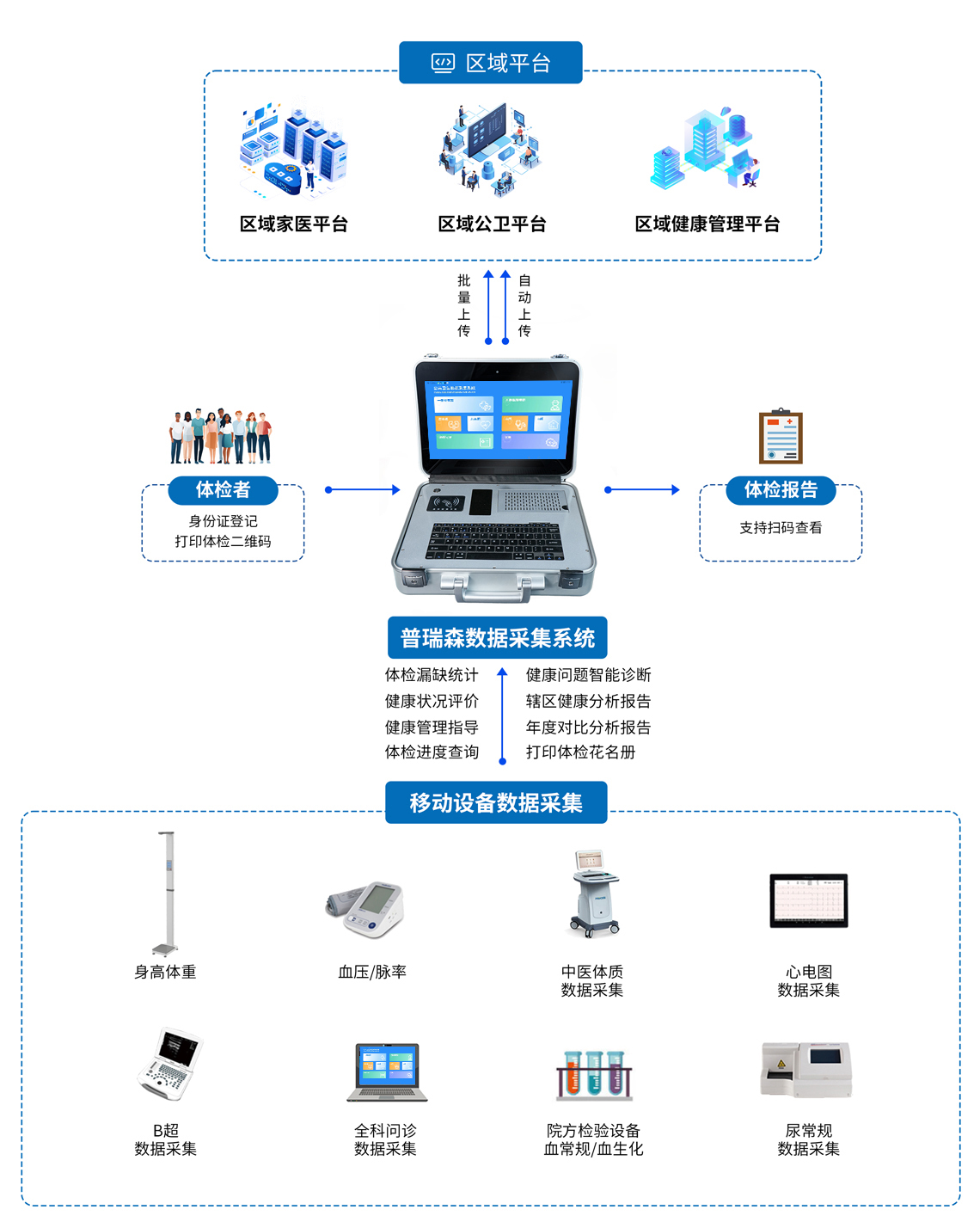 普瑞森公共衛生數據智能采集一體機是按照《國家基本公共衛生服務規范(第三版)》為設計標準,深度剖析基層公共衛生服務工作痛點和醫療機構發展制約因素,以滿足公衛人員便捷使用為核心、以滿足公共衛生考核為要求、以提升居民服務獲得感為宗旨,以信息化手段積極助力基層醫療機構的居民健康服務職能和提升內在服務能力。