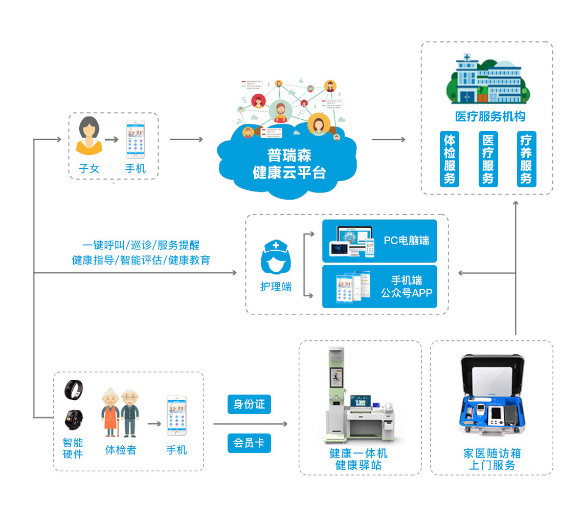 普瑞森·智慧養(yǎng)老解決方案運用各種先進的信息技術(shù)(物聯(lián)網(wǎng)、互聯(lián)網(wǎng)、移動互聯(lián)網(wǎng)技術(shù)、智能呼叫、云技術(shù)、GPS定位技術(shù)等),創(chuàng)建“系統(tǒng)+服務+老人+終端”的智慧醫(yī)養(yǎng)服務模式,并且涵蓋了機構(gòu)養(yǎng)老、居家養(yǎng)老、社區(qū)日間照料等多種養(yǎng)老形式。 通過跨終端的數(shù)據(jù)互聯(lián)及同步,連通各部門及角色,形成一個完整的智慧管理閉環(huán),實現(xiàn)老人與子女、服務機構(gòu)、醫(yī)護人員的信息交互,對老人的身體狀態(tài),安全情況和日常活動進行有效監(jiān)控,及時滿足老人在生活、健康、安全、娛樂等各方面的需求。